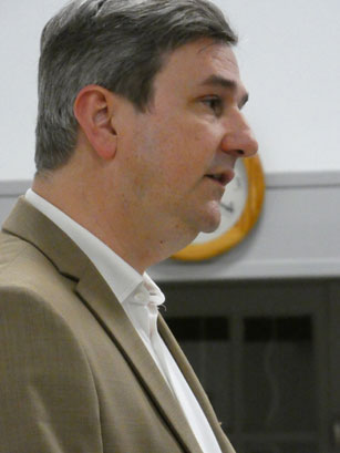 Mais malgré une forte présence dans les manifestations depuis des années, sa popularité auprès des tretsois lambda est évidemment toujours faible. Son début de campagne est de plus on ne peut plus discret, comme évoqué dans la première partie de l’interview, et cela s’est fortement ressenti ce vendredi soir… Il y avait ainsi à peine 43 personnes (colistiers compris) à assister à son discours (dont l’élue d’opposition et colistière de S. Fayolle : Marie Bonnamy) en cette soirée pluvieuse, soit la plus faible affluence pour un premier meeting depuis le suivi des meetings par le site en 2008. Une déception, a-t-il confié. Il faut dire que là aussi, il n’avait quasiment pas fait de communication : juste du tractage pour annoncer la réunion sur le marché, mais pas dans les boîtes aux lettres, très peu sur Internet, pas d’affiches pour annoncer le meeting (il a juste mis enfin de petites affiches électorales sur les panneaux de libre expression de la ville cette semaine), mais n’a surtout distribué aucun tract pour annoncer sa candidature et donc de quoi susciter l’intérêt auprès de ceux qui ne suivent pas la vie tretsoise sur le net et leur donner envie de venir l’écouter. Autant dire qu’il va devoir appuyer sur l’accélérateur puissance 10 niveau communication s’il veut tenter de se qualifier pour un éventuel second tour (au moins 10 % des suffrages exprimés) et être dans l’opposition ensuite, et surtout s’il souhaite devenir maire. En cas de scrutin à un seul tour, tous les candidats seront élus au conseil municipal.