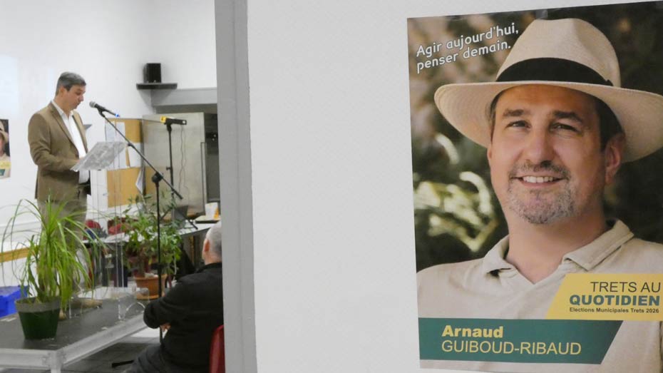 Après Pascal Chauvin il y a un mois, Stéphanie Fayolle samedi dernier, la dernière réunion publique de déclaration de candidature des MUNICIPALES 2026 se tenait ce vendredi 13 février 2026, et c’est le tout nouveau venu dans le ring des Municipales à TRETS qui s’y est collé en la personne d’Arnaud Guiboud-Ribaud. Rendez-vous était donné à 19h au Foyer de l’Olympe, dans une salle à la décoration sobre là encore, avec juste de nombreuses affiches et lui debout sur une petite estrade avec pupitre, entouré de part et d’autre de plantes. Au mur était projeté, façon timbre-poste et de manière illisible, quelques portraits de sa liste, mais qu’il n’évoquera point. En effet, on soulignera que la mairie met à disposition, à égalité parfaite pour TOUS les candidats, le matériel municipal qu’ils désirent pour leurs réunions : chaises, tables, sonos, pupitres, estrades, etc., et chaque candidat est prioritaire dans l’obtention d’une salle pour faire sa réunion.