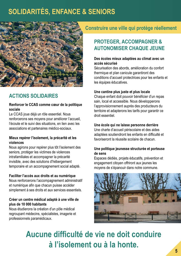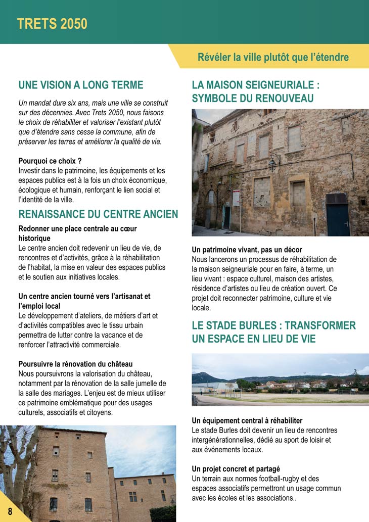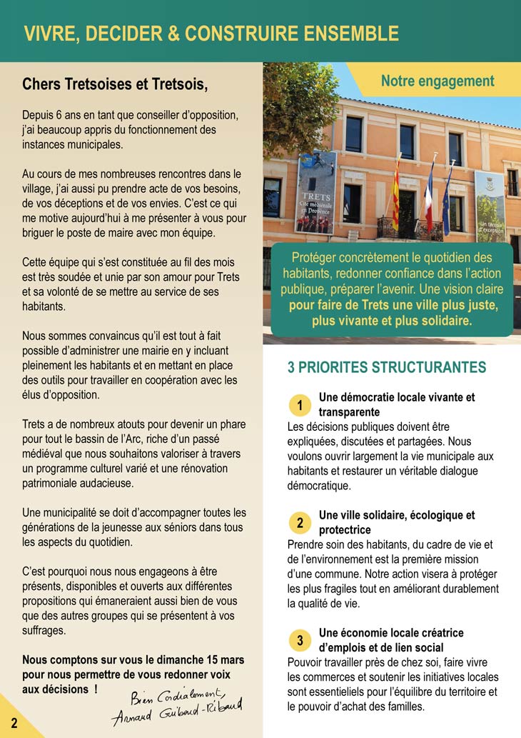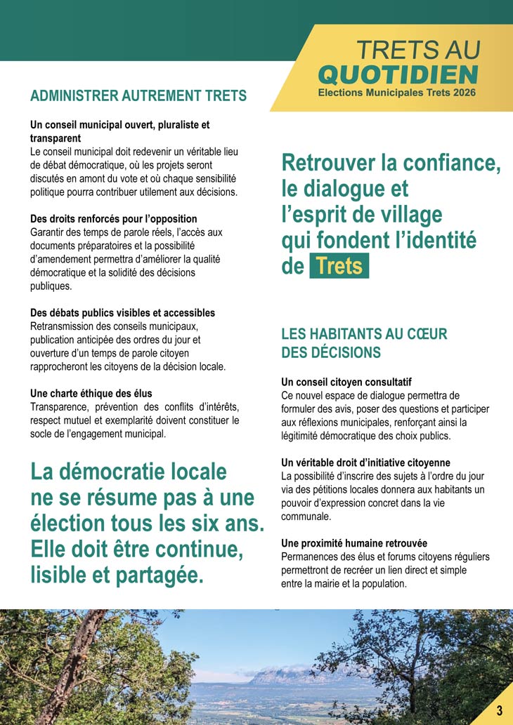 Un document de 12 pages aux couleurs de sa campagne Vert & Jaune, comme les deux autres bien clair et illustré de photos de la commune, qui décline tout son programme mais aussi sa liste. On notera que c’est le seul qui met en avant l’appartenance politique de sa liste dans son document. C’est son 3e tract document distribué aux tretsois. Vous le recevrez dans vos boites aux lettres dès ce week end avant son grand meeting qui se tiendra : Jeudi 12 mars 2026 18h salle des colombes.