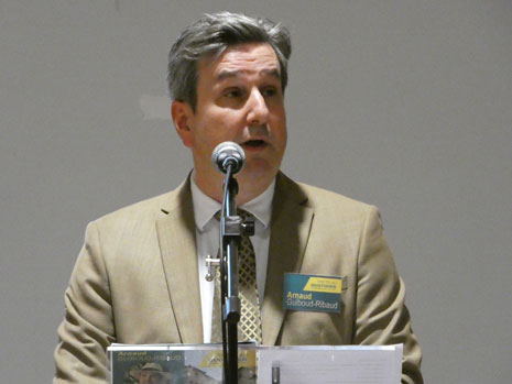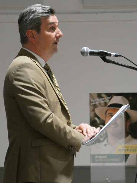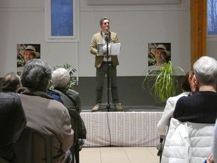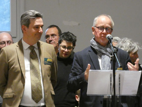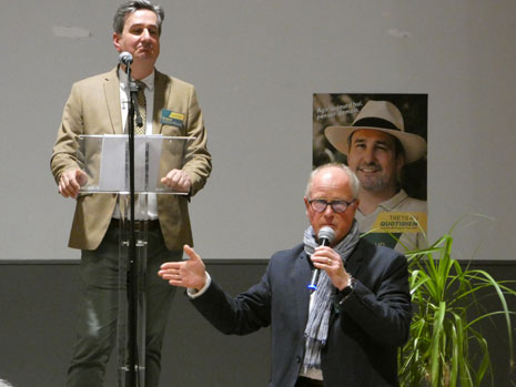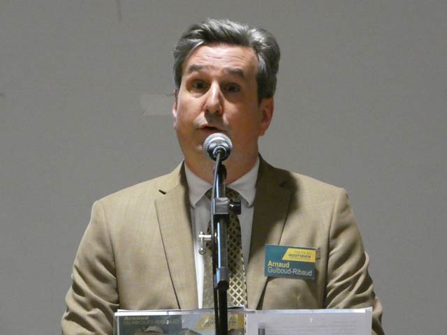 Pas de musique pour lancer le meeting, mais en préambule un petit discours du véritable N°2 de sa liste Michel L’Hour (sans la parité), qui fera ensuite monter sur scène les colistiers présents (une vingtaine) et le candidat. Les colistiers descendront ensuite, laissant la place au discours principal d’Arnaud Guiboud Ribaud, suivi comme la veille d’une longue séance de questions-réponses. Un moment très intéressant car les questions furent très nombreuses et variées, mais certaines étaient aussi pièges et critiques sur ses idées, du jamais vu dans une séance questions réponses avec le public à Trets.
