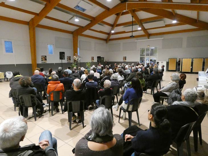 Côté affluence, après la très faible participation de février, celle-ci était encore assez moyenne avec 115 spectateurs (colistiers compris) (chiffre compté un à un comme toujours histoire d’éviter les fameuses guerres de chiffres fantaisistes), mais il a cependant réussi à réunir trois fois plus de monde qu’à son dernier meeting donc, et si on ose la comparaison avec des premières candidatures en meeting, un certain P Chauvin en 2014 pour son premier gros meeting de sa carrière avait réuni 130 personnes, F Laget : 120. Dans l’assistance ce jeudi : un ancien élu sous Feraud, une élue actuelle qui n’est plus sur la liste de P Chauvin et 2 colistiers de S. Fayolle (hier il y en avait une d’Arnaud Guiboud Ribaud).