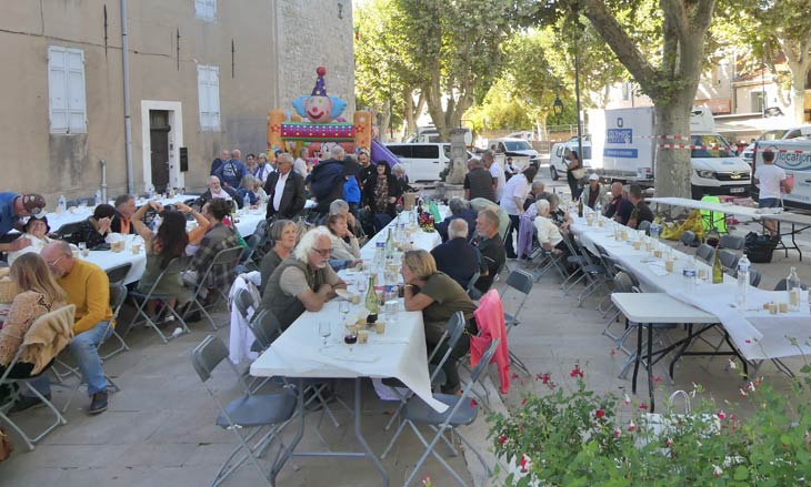 L'apéro achevé, 150 personnes ont participé au grand aioli bien convivial sur la place , soit beaucoup moins que l'an passé, qui fut comme de coutume très animé par Eric Fanino