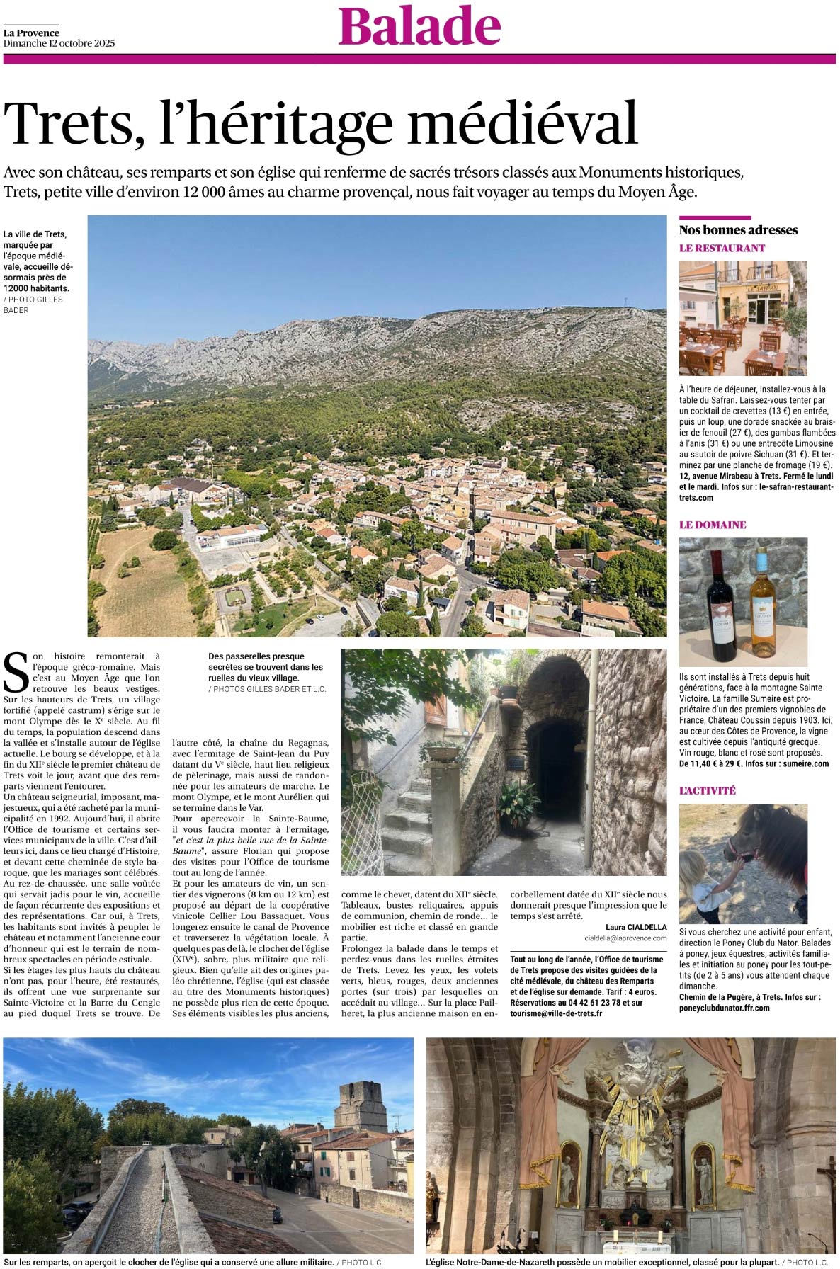 13/10 : Revue de presse patrimoine : Trets à l'honneur dans LA PROVENCE sur une page entière : A la découverte de Trets et de son héritage médiéval
