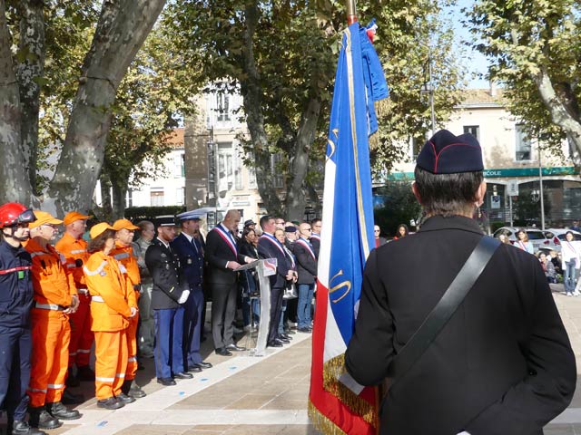 Après un premier recueillement au cimetière, un public particulièrement nombreux s’est réuni à 11h30 sur la place de la mairie aux côtés des élus municipaux (bien nombreux dont les candidats aux municipales), des représentants des anciens combattants de Trets, du Souvenir Français, du Conseil Municipal des Jeunes, de la Légion étrangère, de la gendarmerie, des sapeurs-pompiers et des JSP.