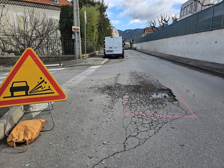 TRAVAUX : Les nids de poule se multiplient comme chaque fin d'hiver sur la commune un peu partout comme ici rue Jules Ferry , où le trou a été bouché quelques jours après ! Si vous en constatez vous pouvez les signaler sur l'application de la mairie