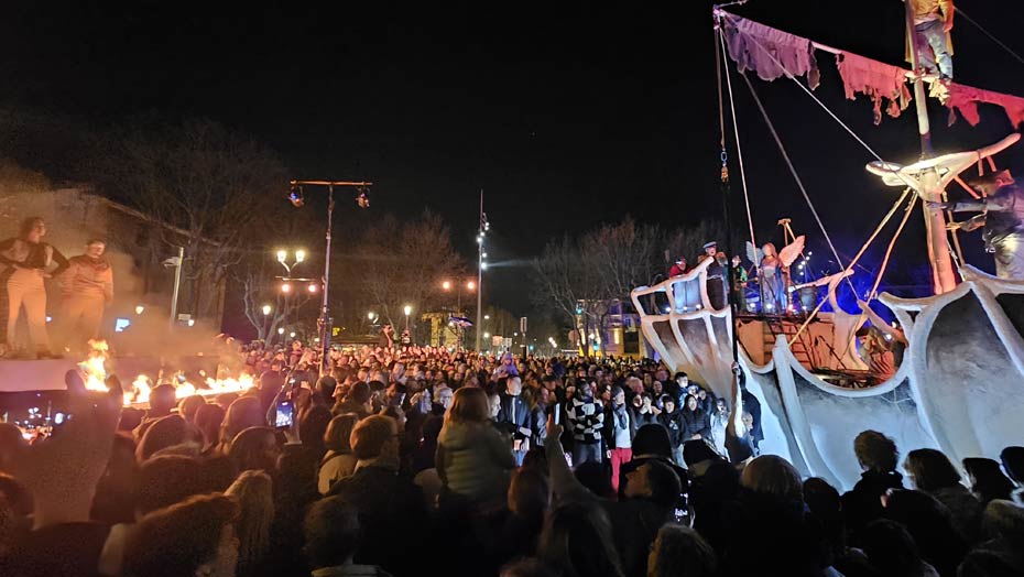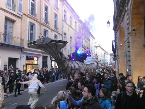Les dizaines de milliers de personnes qui avaient pris place le long du parcours, parmi lesquelles de nombreuses familles et des centaines d’enfants, parfois costumés, ont alors pu assister à une véritable relecture spectaculaire de Moby Dick. En effet cette année, le carnaval proposait un parti pris artistique affirmé : plonger la ville dans l’univers du roman de Herman Melville. Pour porter cette adaptation à l’échelle urbaine, la Compagnie de productions populaires et polymorphes (CPPP) venue du Gard, avait investi les rues et les places du centre-ville, transformant l’espace public en décor vivant.