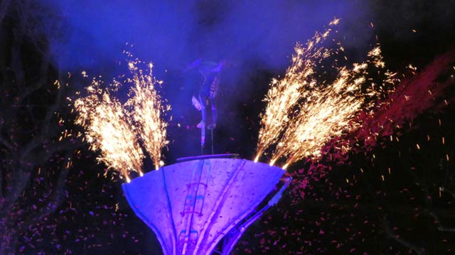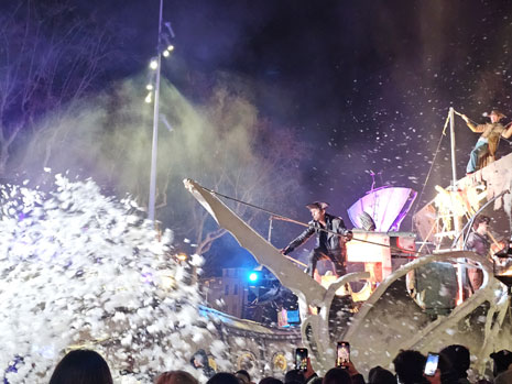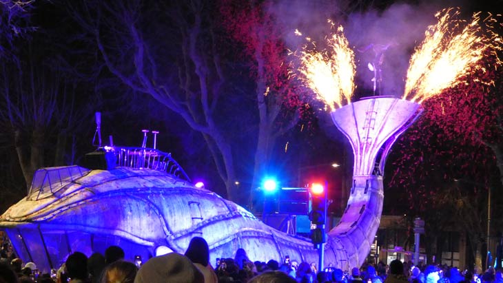 Sur son dos, plusieurs artistes donnaient le rythme, tandis qu’à l’intérieur de la structure, éclairée de néons violets, un DJ masqué accompagnait la progression du cortège de percussions soutenues. La queue articulée du cétacé projetait par moments de grosses gerbes d’eau vers les spectateurs, déclenchant les rires des enfants massés au premier rang, ou même une pluie de pyrotechnies