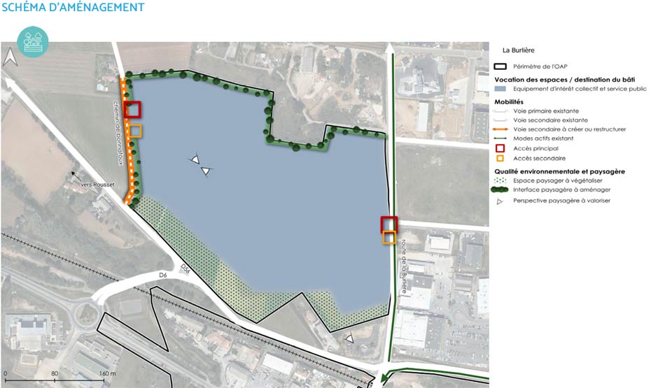 - La proximité d’infrastructures de transports (telles que le pôle multimodal). La proximité du centre-ville et des futurs quartiers résidentiels en fait un emplacement stratégique pour un équipement d’intérêt collectif. Le périmètre du projet intègre la zone 2 AU ainsi que la zone UP existante. Ce secteur sera reclassé compte tenu de la spécificité du projet et de la nature des équipements en zone 1AUSd. Une Orientation d’Aménagement et de Programmation (OAP) traduira les composantes du projet dont les éléments de programmes sont les suivants :